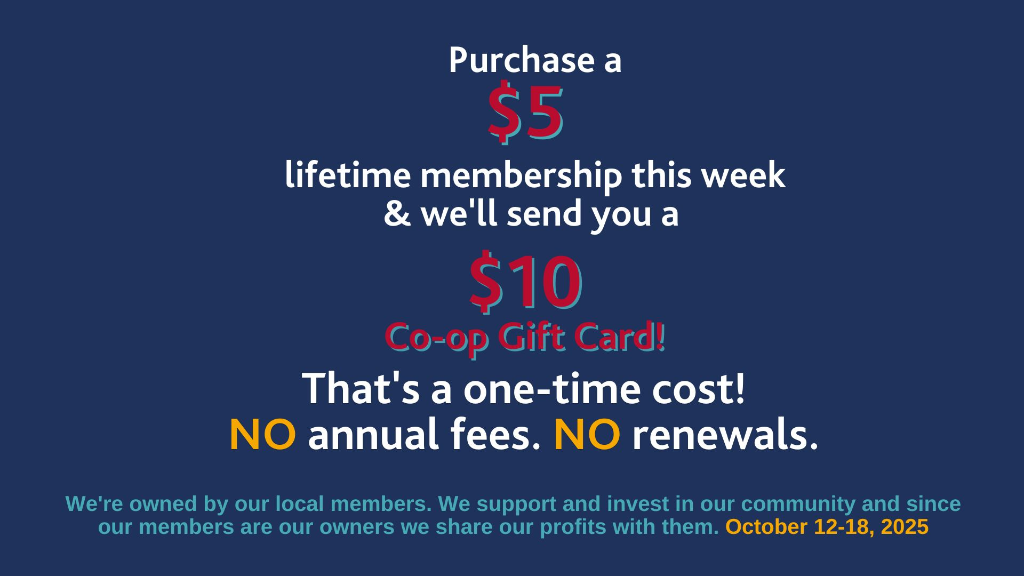 Join the fun! Visit us on socials or stop by a membership tables. Are you a member? Enter for your chance to win your choice of a Food Store Shopping Spree or a $500 Co-op Gift Card at our membership tables!